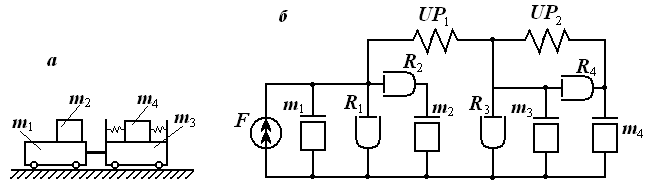 Рис. 4. Пример механической поступательной системы (а) и ее эквивалентная схема (б).