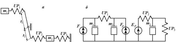 Рис. 5. Пример рычажной механической системы (а) и ее эквивалентная схема (б).
