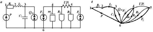 Рис. 3. Эквивалентная схема гидромеханической системы (а) и ее граф (б) с выделенным фундаментальным деревом.