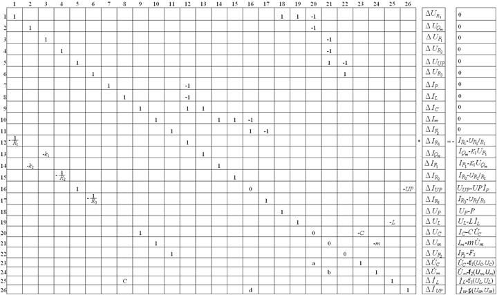 Расположение переменных в этом векторе следующее: подвектор Ux, подвектор IВ.Д, подвектор Ix, подвектор UВ.Д, подвектор производных переменных состояния для реактивных элементов. Система уравнений типа