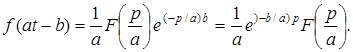 Пример. Найти изображение функции f(at - b), если f(t) =F(p). Применяя теоремы подобия и запаздывания, получим