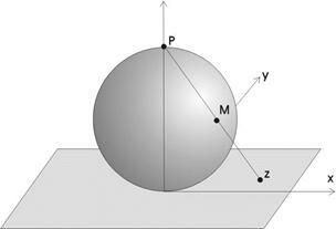 | Сфера находится на комплексной плоскости. Проведем прямую из верхней точки сферы (ее северного полюса) в какую-либо точку |