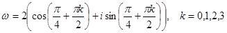 Все корни лежат на круге радиусом 2 с центром в начале координат, на угловом расстоянии