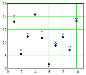 Для вычисления этих усреднённых необходима матрица размеров 1024х10 с расположенными в случайном порядке элементами из чисел +1 и –1. На компьютере такая матрица может быть получена с использованием функции RANDBETWEEN(1,2) программы Microsoft Excel. Эта функция позволяет получить требуемую матрицу с элементами в виде двух чисел, которые можно заменить на +1 и –1 с использованием Microsoft Word. Далее, используя программу Mathcad, эта матрица умножается справа на вектор абсолютных значений столбца разностей d=B–A таблицы 10.2.1 и получаемый вектор делится на 10. Результат такого вычисления даёт 1024 усреднённых разности.