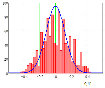 Рис.10.2.2. Гистограмма усреднённых разностей и график функции плотности вероятности нормированного нормального распределения