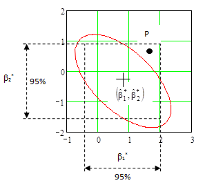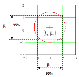 Следовательно, круговая совместная 95% доверительная область параметров b1* и b2* с центром в точке с координатами (