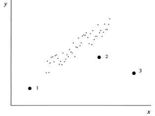 На Рис. 8.7.1 показаны влиятельные наблюдения для случая с одним фактором х [Rencher, Schaalje (2008) стр. 236]. Точки 1 и 3 являются резко выделяющимися значениями по оси х, а точки 2 и 3 скорее всего появятся в качестве резко выделяющихся значений по оси у. Даже с учётом того, что точка 1 является крайней по оси х, она не будет сильно влиять на оценку параметров модели. Точка 3 будет иметь значительное влияние на результат оценки параметров, так как она сильно удалена от остальных данных. Точка 2 также будет влиять, но гораздо в меньшей степени, чем точка 3.