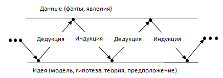 Повторяющийся процесс познания путём индукции-дедукции известен со времён Аристотеля. Положим, желательно решить отдельную проблему и исходное размышление даёт некоторую заслуживающую внимания идею. После этого ищутся данные, которые поддерживают или противоречат этой идее. Это может состоять из следующего: поиск файлов в интернете, посещение библиотеки, встреча с сотрудниками и начальством для мозгового штурма, пассивное наблюдение процесса или экспериментирование. В любом случае, собранные факты и данные иногда подтверждают предположение и, в этом случае, проблема может быть решена. Однако часто получается, что начальная идея только частично правильна или, возможно, полностью неправильна. В этих двух случаях разница между логическим выводом и действительностью заставляет продолжать работать. Это может привести к модифицированной или совершенно новой идее и к повторному анализу существующих данных или к получению новых данных.