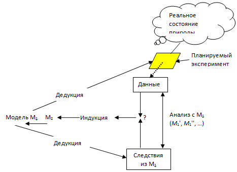 На Рис.2 процесс дедуктивно-индуктивного повторения показан в виде контура с обратной связью. Исходная идея (гипотеза, модель) слева на диаграмме обозначается М1. Посредством дедукции анализируются ожидаемые следствия идеи М1 – что будет, если эта идея верна, и что будет, если она ложна. Устанавливается также какие данные необходимы для проверки идеи М1. Планируемый эксперимент представляется в виде окна, через которое видятся некоторые аспекты реального состояния природы. При этом необходимо помнить, что при проведении эксперимента его план выбирается исследователем. Получаемые данные представляют некоторый аспект (хотя не всегда значимый) реального состояния природы, который в той или иной степени неясный из-за «шума», то есть ошибок эксперимента. Анализируемые данные сравниваются с логически полученными следствиями идеи М1. Если они согласуются, то проблема решена, а если нет, то вид их расхождения может помочь обнаружить как надо изменить исходную идею М1.