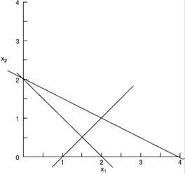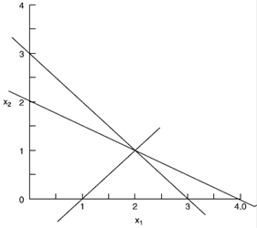На Рис. П.7.2 представляющие три уравнения линии показывают, что они не имеют общей точки пересечения. [Для получения "наилучшего" приближенного решения, один из способов его получения заключается в использовании метода наименьших квадратов, то есть нахождения таких значений x1 и x2, которые минимизируют сумму квадратов (х1+2х2–4)2+(х1–х2–1)2+(х1+х2–2)2.]