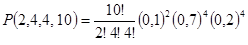 2) Мишень для опытного стрелка содержит три круговых кольца: 10, 9, пусто. Вероятность попасть при одном выстреле в десятку – 0,2, в девятку – 0,7, в «пусто» – 0,1. Какова вероятность в серии из 10 выстрелов попасть в «пусто» два раза, в девятку 4 раза, в десятку 4 раза?