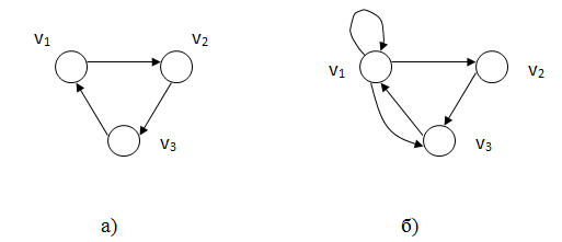 Пусть V = {v1, v2, v3}, E1 =  {(v1, v2), (v2, v3), (v3, v1)}. Тогда получим граф G1 = (V, E1) (рис. 3, а).
