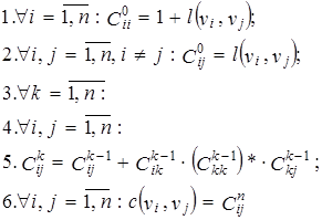Выход. Для любых i и j, изменяющихся в диапазоне от 1 до n найти элемент c(vi, vj) Î S. Это сумма по всем путям из vi, в vj меток этих путей.