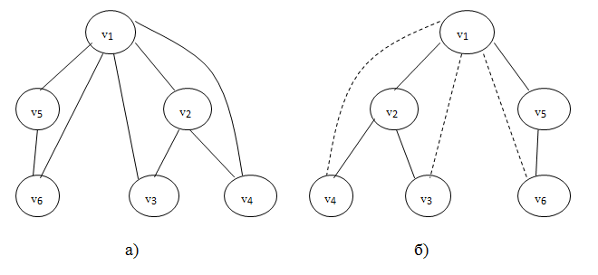 Обычно ребра, входящие в T, изображают сплошными линиями, а ребра из B – пунктирными. Корень (то есть вершину, выбранную за начало поиска) рисуют сверху, а сыновей располагают слева направо в порядке их прохождения (рис. 17).