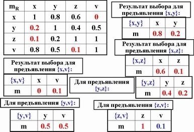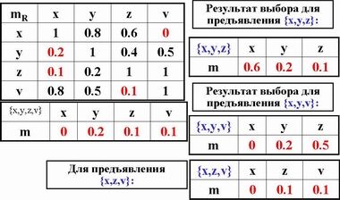 1. Для каждого предъявления составляется нечеткое отношение путем удаления из исходной матрицы строк и столбцов вариантов, отсутствующих в предъявлении.
