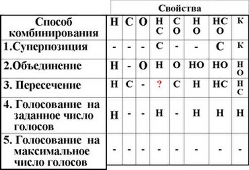 В случае объединения двух механизмов – выбираются те варианты, которые выбраны хотя бы одним механизмом (логическое «ИЛИ»). Не выбираются те варианты, которые отвергнуты всеми механизмами.
