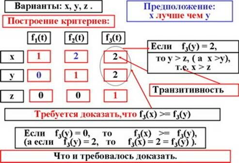 Возьмем произвольные 3 варианта x, y, z и три соответствующие им компоненты векторного критерия f1(t) = Jx(t), f2(t) = Jy(t), f3(t) = Jz(t).