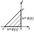 Рассмотрим задачу для области, показанной на рисунке. При этом потребуем, чтобы на отрезке (x’;0) решение принимало значение u=φ(x), а на отрезке (0;t’) u=ψ(t). Эта задача похожа на предыдущую, но решение ее не существует. Если потребовать, чтобы решение задачи при t=0 принимало значение φ(x), то можем записать u=φ(x-t), где φ – известная (заданная) функция.