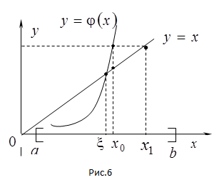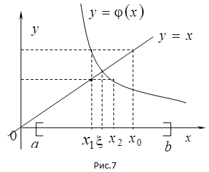 . В этом случае (Рис.7) итерации попеременно оказываются то с одной, то с другой стороны корня, так что корень заключен в интервале