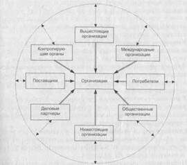 Структуру внешней среды организации образуют входя­щие в нее элементы и их взаимосвязи (см. рис. 4.1). К таким элементам прежде всего относятся поставщики, потребите­ли, деловые партнеры, вышестоящие организации (в т. ч. материнские компании), нижестоящие организации (в т. ч. дочерние предприятия, представительства и филиалы), кон­тролирующие органы, международные организации, обще­ственные организации (профсоюзы, политические партии, общественные движения) и т. п.