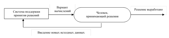 Главной особенностью информационной технологии поддержки принятия решений является качественно новый метод организации взаимодействия человека и компьютера. Выработка решения, что является основной целью этой технологии, происходит в результате итерационного процесса (рис. 3.15), в котором участвуют: