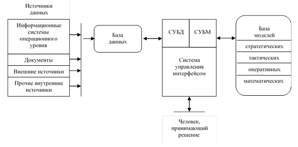В состав системы поддержки принятия решений входят три главных компонента: база данных, база моделей и программная подсистема, которая состоит из системы управления базой данных (СУБД), системы управления базой моделей (СУБМ) и системы управления интерфейсом между пользователем и компьютером.
