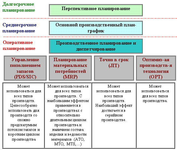Планирование для производственных предприятий в общем случае описывается четырьмя функциональными уровнями, каждый из которых определяется длительностью горизонта планирования и субъектами планирования (Рис. 4):