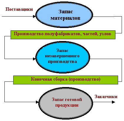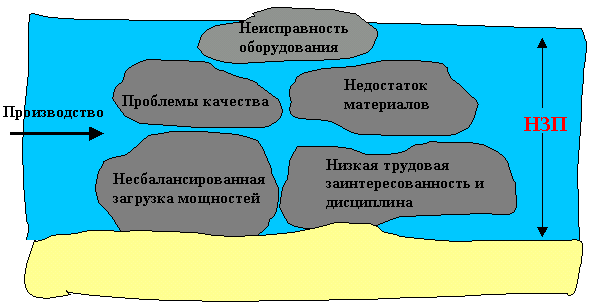 Система «Точно в срок» основной акцент делает на сокращении уровня запасов материалов и незавершенного производства на каждой стадии производства. Причины роста незавершенного производства, как правило определяются созданием страховых запасов, выходом из строя оборудования, низкой квалификацией персонала и т.д. (Рис. 8)