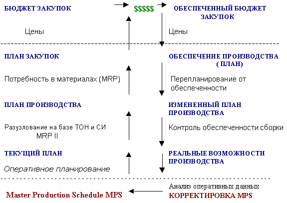 Система MRP II предназначена для планирования всех ресурсов предприятия для реализации производственного плана – материалов, мощностей и денег. Упрощенная последовательность планирования уже была представлена петлей планирования на Рис 7.