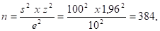 Уровень достоверности при проведении маркетинговых исследований обычно оценивается с учетом двух его значений: 95% или 99%. Первому значению соответствует значение z = 1,96; второму – z = 2,58. Если выбирается уровень доверительности равный 99 %, то это говорит о следующем: мы уверены на 99 % (иными словами доверительная вероятность равна 0,99) в том, что процент членов совокупности, попавший в диапазон плюс – минус е %, равен проценту членов выборки, попавших в тот же диапазон ошибки. Принимая вариацию равной 50 %, точность равной 10 % при 95 %-м уровне доверительности рассчитаем размер выборки: