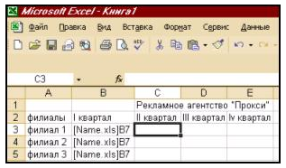 С целью решения данной задачи построим электронную таблицу, объединяющую отчеты, поступающие из каждого филиала. Для более точного решения будем рассматривать учеты по кварталам.