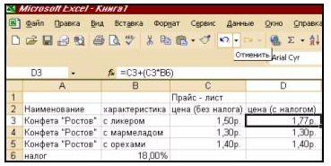 Параметры: наименование, характеристика цена без налога - вводятся пользователем самостоятельно, а конечная цена рассчитывается с помощью электронной таблицы.