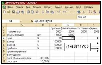 Расходы и продажные цены определяются с учетом заданного роста цен, а объем продаж с учетом объема продаж. При изменении прогнозируемых допущений электронная таблица должна немедленно пересчитывать значения всех прогнозируемых финансовых характеристик. Разработанную электронную таблицу следует защитить от внесения несанкционированных изменений, кроме ячеек, содержащих значение, прогнозируемых допущений.