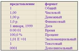 Любые данные, которые не распознаются программой в качестве числовых, интерпретируются как текстовые. Длина текста, помещающаяся в ячейку не может превышать 255 символов. Данные любого типа могут быть представлены в определенном формате. Пример: приведем пример представления 1 в различных форматах.