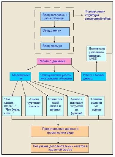 Расширением таких задач являются задачи анализа чувствительности, позволяющие определить как изменяется решение модели при изменении входных величин, заданным шагом в определенном диапазоне значений. Задача компьютерной модели «как сделать чтобы...?» возникает в случае если цель достижения определенного значения модели, пользователь ищет значение входных параметров, обеспечивающих достижение этой цели. Различные виды анализа данных, содержащихся в исходной таблице можно проводить с использованием функций и процедур. Пример: входящие в состав электронной таблицы статистические функции могут быть использованы в статистическом анализе или для прогноза, содержащихся в таблице данных. Использование финансовых функций позволяет произвести анализ эффективности, планируемых капиталовложений, рассчитать стоимость ценных бумаг. Для решения оптимизационных задач используются специальные модели математического программирования. Пример: если рекламная фирма имеет центральный офис и несколько филиалов, то появляется задача объединения документов и отчетов, приходящих из этих филиалов. Решение подобной задачи требует использования специальных многотабличных связей и программных методов для манипулирования с данными и генерации отчетных форм. Одновременная работа с несколькими таблицами - это одна из возможностей работы с данными в электронной таблицы. Если при работе с большими электронными таблицами требуется найти ту или иную строку (столбец) или отсортировать строки (столбцы) в нужном порядке, то следует использовать инструментарий СУБД, в этом случае электронная таблица интерпретируется как база данных.