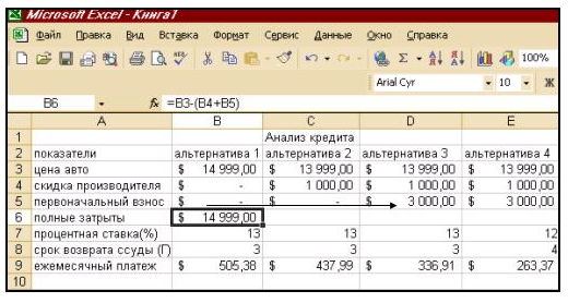 Разработанная таблица дает возможность выбрать покупателю 1 из 4 альтернатив и ответить на следующие вопросы: альтернатива 1- может ли покупатель выплачивать определенный месячный платеж за машину; альтернатива 2- что будет если вы согласитесь на дорогой авто и получите ссуду от его производителя; альтернатива 3- что будет если вы следующим летом заработаете некоторую сумму для первого платежа; альтернатива 4 - что будет, если вы увеличите срок возврата суды и получите более низкую процентную ставку.