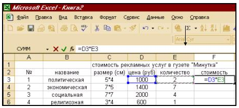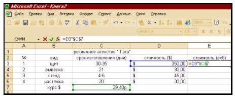 Особенностью использования относительной адресации является тот факт, что формулу вычисления стоимости пользователь вводит в соответственную ячейку лишь 1 раз, а затем после успешного выполнения копирует по столбцу вниз.