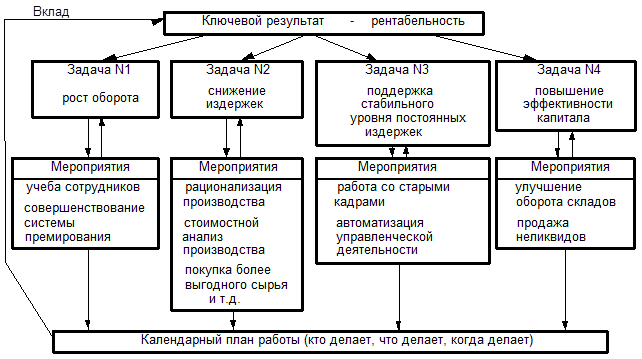 Конкретизация этих политик происходит в письменных и устных директивах практически ежедневно относительно той или иной ситуации. Следует избегать обилия бюрократических инструкций, привлекать к составлению необходимых указаний сотрудников. Практические действия организации излагаются в конкретных планах работы (мероприятиях). Пример связи ключевых результатов, задач, мероприятий и календарного плана - на рис. 33.