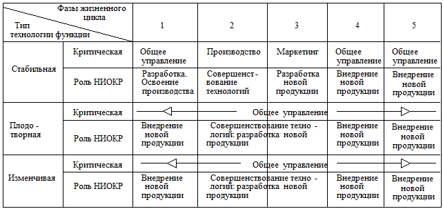 В зависимости от типа технологии в разных фазах жизненного цикла продукта определяются критические сферы управления фирмой, а также меняется роль сферы НИОКР. Это иллюстрировано таблицей 15.1.