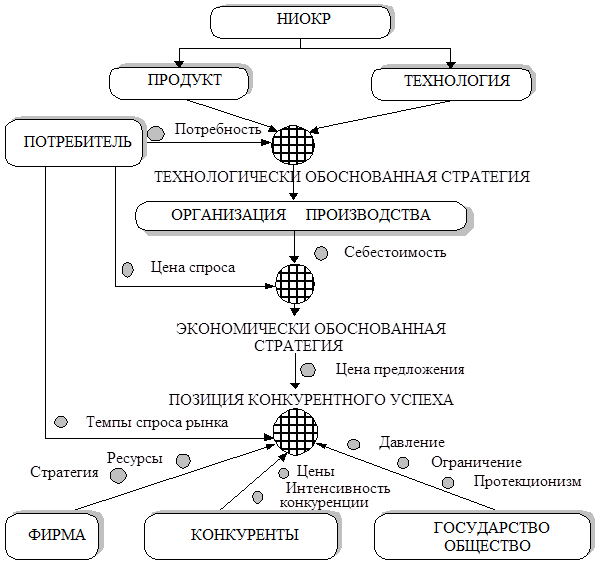 Мы видим, что наличие потребности на рынке в продукте и технологии для этого производства создает технологически обоснованную позицию. Соединение этих факторов с экономическими возможностями покупателей дает виртуальную экономическую позицию (без учета возможной конкуренции). И только учет действий покупателей на рынке, конкурентов, государства, социально - политических групп, а также возможности фирмы и стратегия их использования создают позицию конкурентного успеха фирмы в производстве и коммерческой реализации товара.