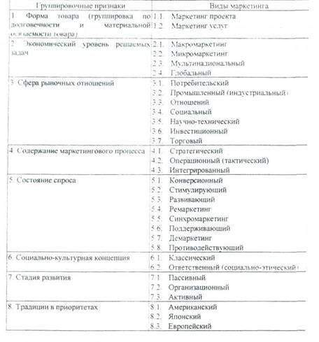 Маркетинг можно условно распределить по различным группировочным признакам. Украинский ученый-маркетолог проф. Семеняк И.В. приводит следующую классификацию типов маркетинга
