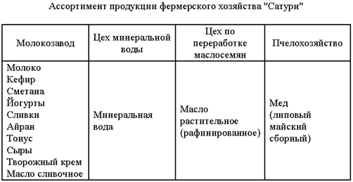 Обычно предприятие предлагает группу близко связанных между собой товаров составляющих продуктовую линию или товарный ассортимент. В табл. представлен ассортимент продукции фермерского хозяйства "Сатурн".