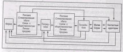 Современная фирма управляет сложной системой маркетинговых коммуникаций (рис. 1). Сама она поддерживает коммуникации со своими посредниками, потребителями и различными контактными аудиториями. Ее посредники поддерживают коммуникации со своими потребителями и различными контактными аудиториями. Потребители занимаются устной коммуникацией в виде молвы и слухов друг с другом и другими контактными аудиториями. И одновременно каждая группа поддерживает коммуникационную обратную связь со всеми остальными.