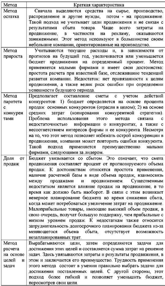 - подходсверху вниз предполагает первоначальное выделение средств на бюджет продвижения с последующим распределением этой суммы между различными средствами продвижения. Достоинство этого метода состоит в том, что комплекс продвижения рассматривается не изолированно, а как составная часть стратегии маркетинга. Это позволяет проводить необходимые действия для информирования целевой аудитории и воздействия на нее. Недостатком является возможность упустить некоторые цели и задачи конкретных средств продвижения;