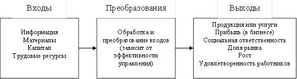 Рисунок 7.1. представляет собой упрощенное изображение организации как открытой системы. На входе организация получает от окружающей среды информацию, капитал, человеческие ресурсы и материалы. Эти компоненты называются входами. В процессе преобразования организация обрабатывает эти входы, преобразуя их в продукцию или услуги. Эта продукция и услуги являются выходами организации, которые она выносит в окружающую среду. Если организация управления эффективна, то в ходе процесса преобразования образуется добавочная стоимость входов. В результате появляются многие возможные дополнительные выходы, такие как прибыль, увеличение доли рынка, увеличение объема продаж (в бизнесе), реализация социальной ответственности, удовлетворение работников, рост организации и т.п.