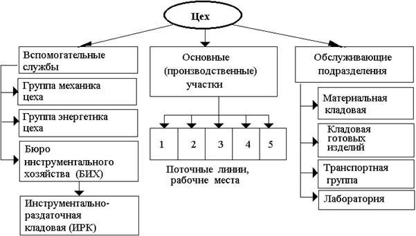 Средние и крупные цехи имеют в своем составе более 50 единиц оборудования и более 100 работников и обладают довольно сложной структурой, зависящей от особенностей технологии.