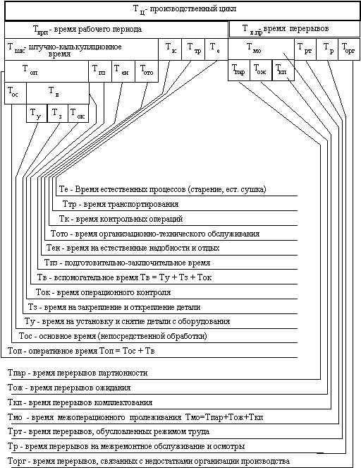 Время перерывов (Твпр) обусловлено режимом труда (Трт), межоперационным пролеживанием детали (Тмо), временем перерывов на межремонтное обслуживание и осмотры оборудования (Тр) и временем перерывов, связанных с недостатками организации производства (Торг):