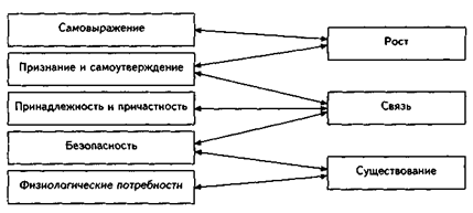 Теорию потребностей существования, связи и роста (или ERG — Existence, Relations, Growth) разработал в 1972 г. американский уче­ный К. Альдерфер [19]. Он предпринял попытку уточнить и творче­ски развить теорию иерархии потребностей А. Маслоу. Отмечая не­достаточную четкость различения некоторых групп потребностей в теории А. Маслоу, он выделил не пять, а три класса (группы) по­требностей: существования, связи и роста.