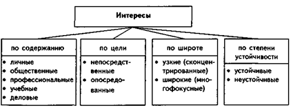 Удовлетворение интереса к объекту, обладающему устойчивой значимостью, как правило, не приводит к угасанию интереса, а может обогатить и углубить его, вызвать возникновение новых интересов. Интересы являются постоянным побудительным "механизмом" познания. Классифицируют интересы по содержанию цели, широте и степени устойчивости (рис. 2.6).