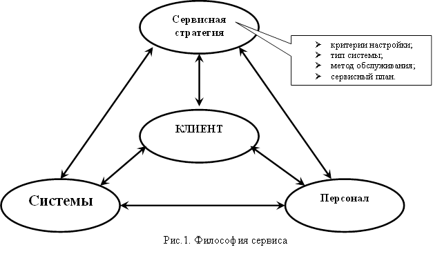 Философия обслуживания отображена в сервисном треугольнике, приведенном на рис.1.